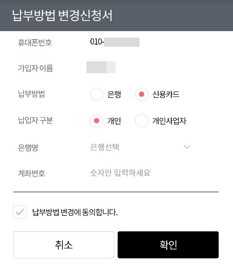 납부방법 변경 동의란에 체크 후 확인을 눌러주세요.