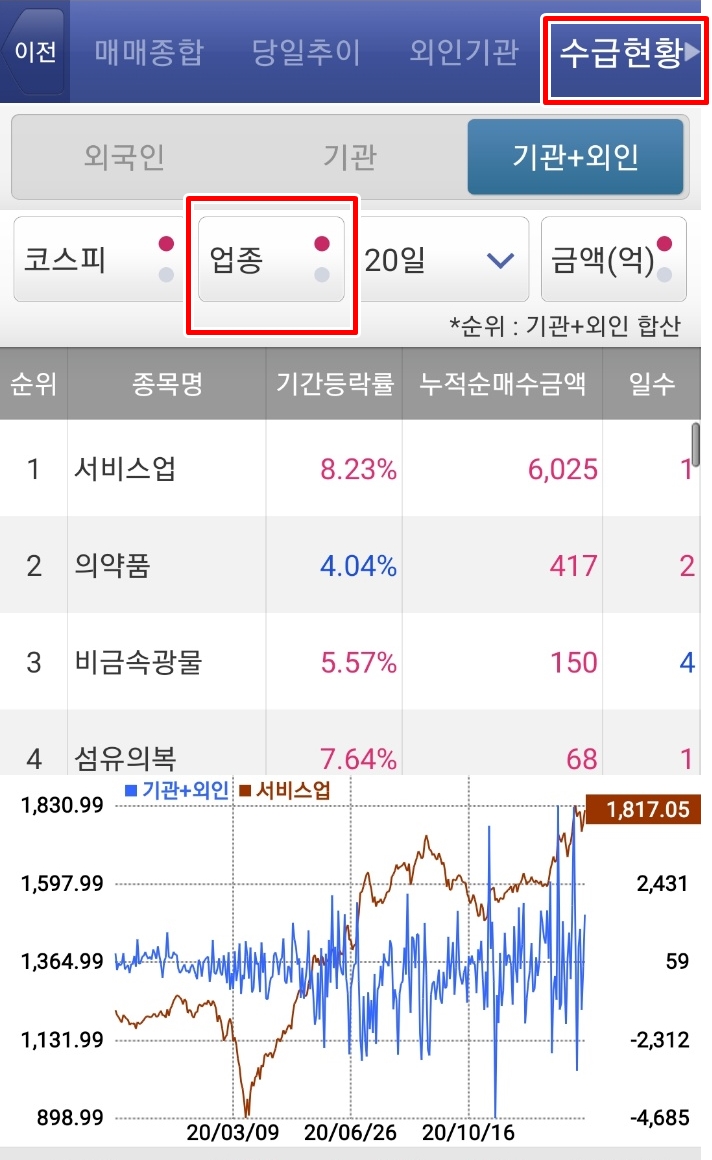 외인과 기관이 어떤 종목을 매수하고 있는지, 어떤 업종을 많이 매매하고 있는지 확인할 수 있습니다.