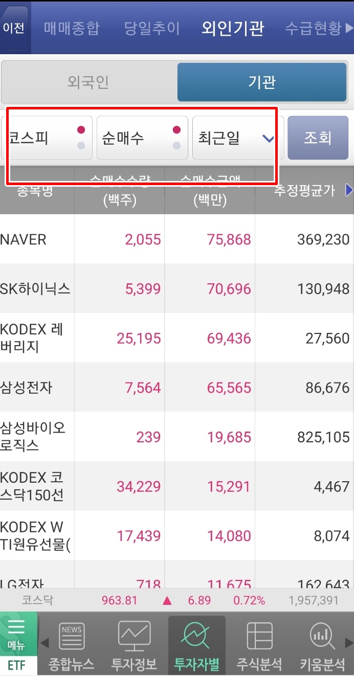이 기능을 활용하면 외국인과 기관이 순매수, 순매도 한 종목이 어떤 건지 쉽게 확인할 수 있습니다.