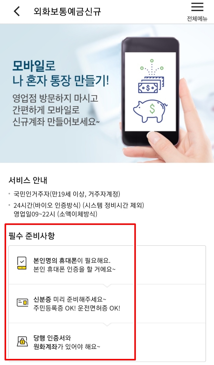 외화통장 개설 서비스는 24시간 가능하다고 하는데 막상 저녁 늦은 시간에 진행했더니 송금 서비스가 불가한 시간이라고 해서 결국 다음날 다시 신청했습니다.