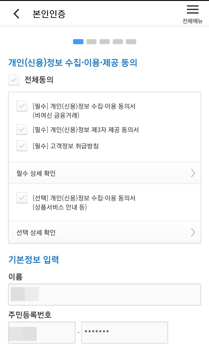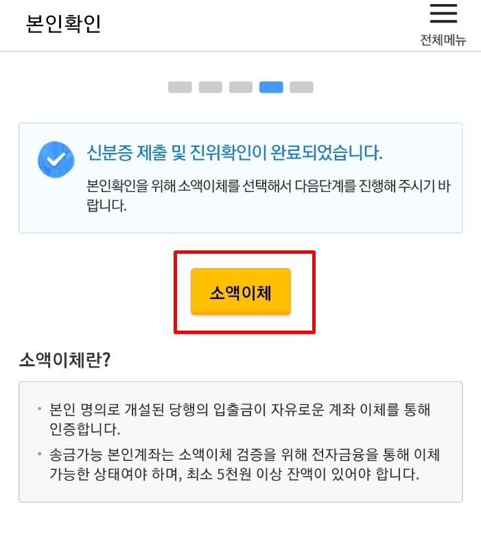 신분증 제출까지 완료하면 소액이체 단계만 남았습니다.