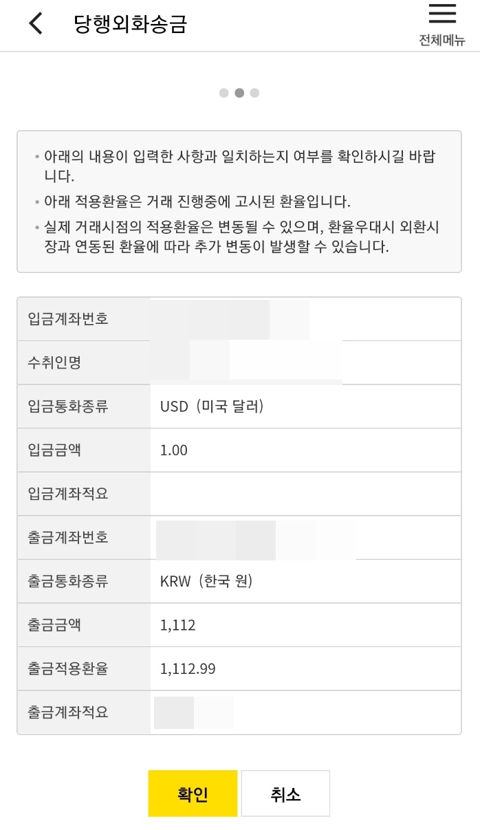 입력한 정보가 맞는지 체크하고 화인을 눌러주시면 이제 외화통장 개설에 필요한 모든 과정은 완료되었습니다.