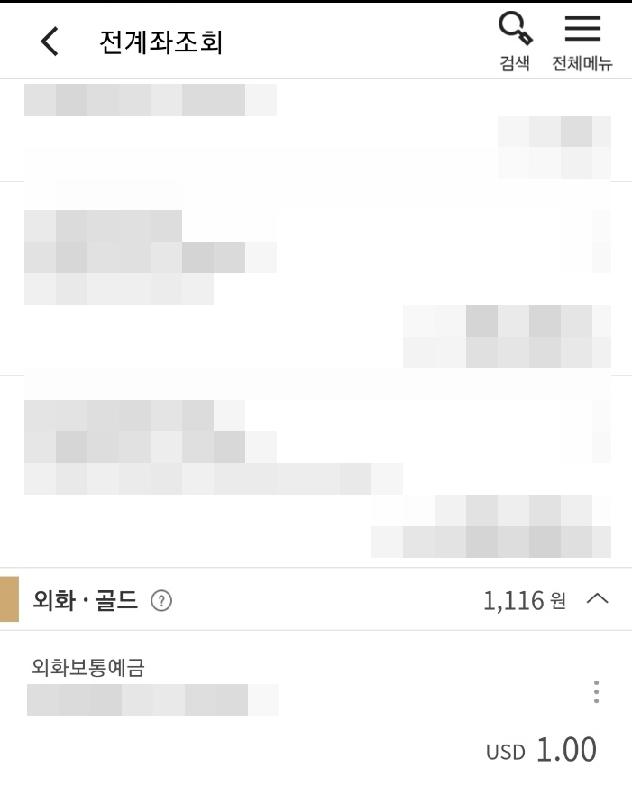 전 계좌조회 상단에는 원화계좌 내역이 있고 바로 밑에 외화/골드 카테고리가 있습니다.