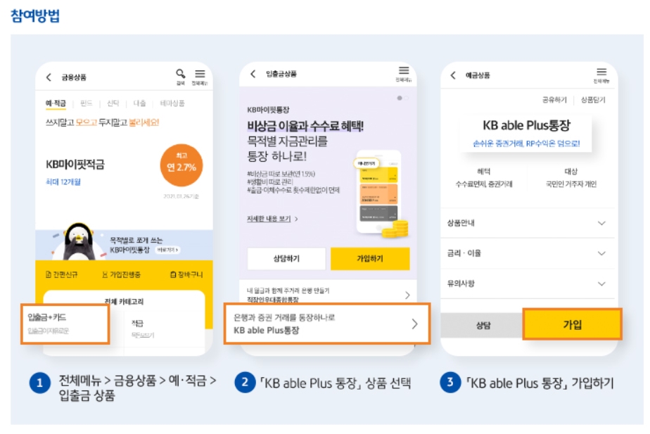 현재 KB able Plus 통장을 신규개설 하는 경우 여러 가지 이벤트 혜택이 있습니다.