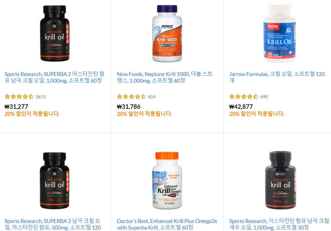 아이허브닷컴 크릴 오일 제품들을 20% 할인된 가격으로 구입할 수 있습니다. 여러 가지 브랜드의 크릴 오일 제품을 비교해보고 고를 수 있다는 장점이 있습니다.