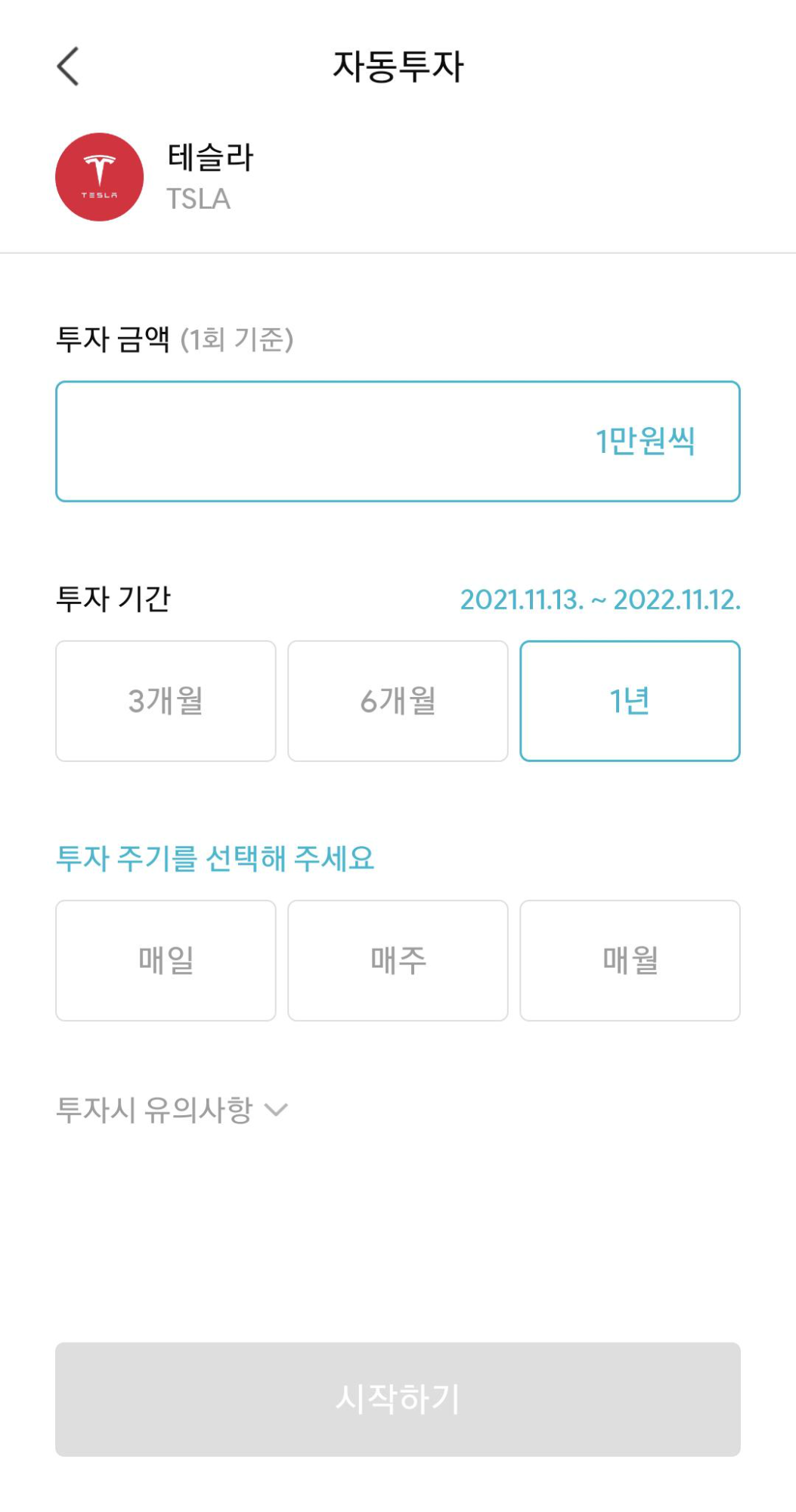 - 투자 주기도 선택해 주세요. 매주/매월 투자 주기를 설정하면 어떤 요일에 투자를 할지, 어떤 날짜에 투자를 할지 설정할 수 있습니다.