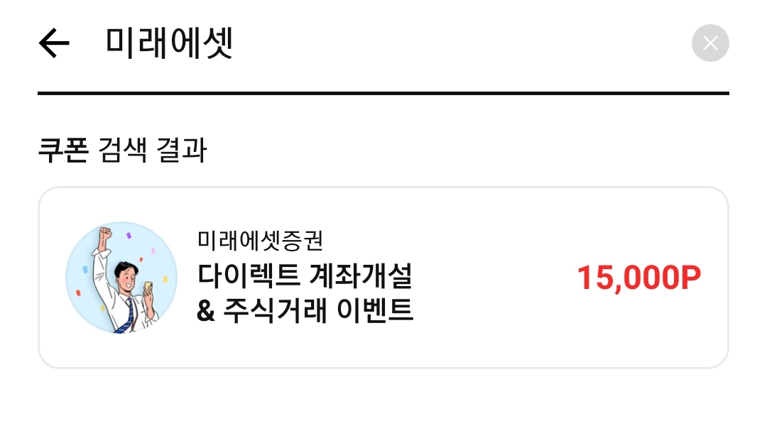 페이코 앱을 사용하시는 분들도 추가 혜택을 받으실 수 있습니다. 페이코 앱에 접속하셔서 쿠폰 화면으로 들어가 주세요. 쿠폰 화면 상단에 검색창이 있습니다. 검색창에 미래에셋 혹은 미래에셋증권을 검색해 주세요.