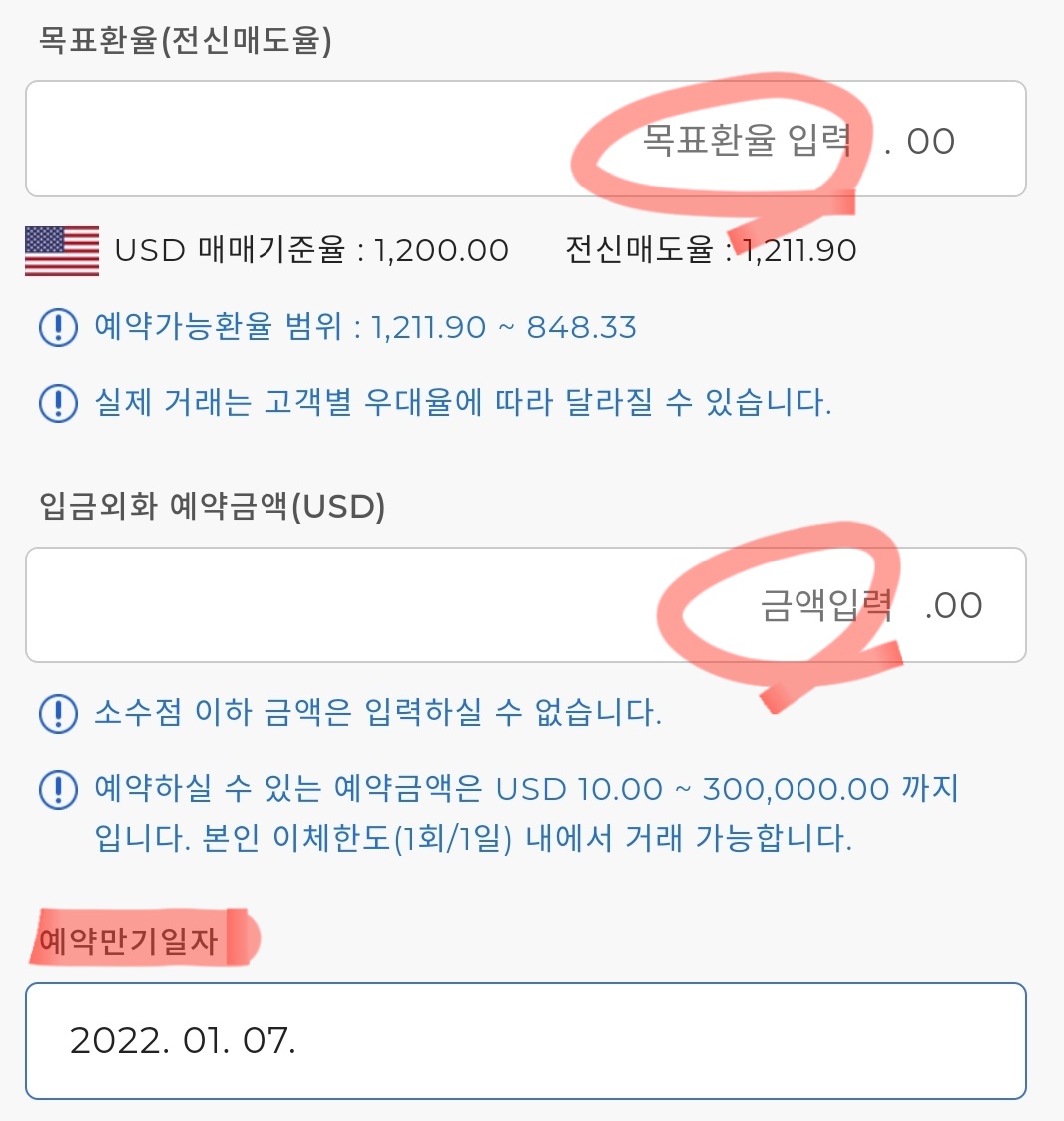 목표환율 입력란 및에 현재 매매기준율을 기준으로 예약 가능환율 범위를 확인하실 수 있습니다. 해당 범위 내에서 원하는 목표환율(전신 매도율)을 입력 및 매수하고 싶은 금액을 입력해 주세요.