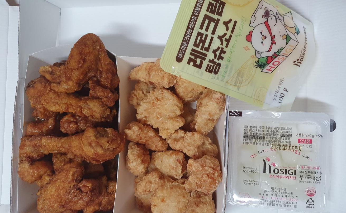 즐겨먹는 치킨 브랜드 중 하나는 호식이 두마리 치킨입니다. 순살과 뼈있는 치킨을 변경할 수 있고 맛도 다양해서 자주 주문해 먹는데 이번에는 새로운 메뉴인 레몬크림탕슈를 시켰습니다. 레몬크림탕슈와 잘 어울리는 메뉴로 매운간장을 추천받아서 두마리 세트로 주문을 했습니다.