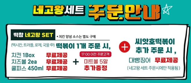 떡볶이 1개 주문 시 치킨 1박스, 치즈볼 2개, 쿨피스 450ml 한 개 무료 제공됩니다. 17:00이전 주문고객에게는 미트볼 5알이 추가 증정됩니다. 또한 떡볶이를 주문하시면서 씨앗호떡볶이를 추가 주문하시면 대빵징어가 무료제공됩니다. 대빵징어 제공 이벤트는 네고왕 세트 주문시에만 적용된다고 합니다.