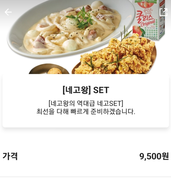 떡참 네고왕 set 가격은 9500원입니다. 9500원에 떡볶이, 치킨, 치즈볼, 쿨피스 구성이면 가성비가 정말 좋아 보이네요. 추가로 씨앗호떡볶이를 주문하면 인기메뉴인 대빵징어까지 제공되니까 17:00 이전 주문에 씨앗호떡볶이 추가 주문이면 모든 혜택을 적용할 수 있습니다.