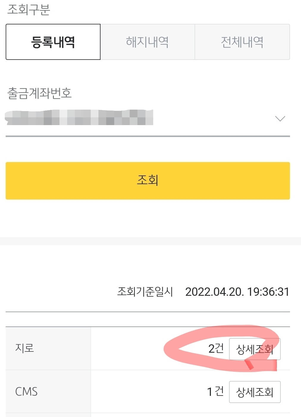 위 화면은 현재 자동이체 등록내역 확인 상세화면입니다. 해당 화면에서 하단을 보시면 지로 및 cms 신청내역과 상세조회를 해보실 수 있습니다. 상세조회 버튼을 누르면 어떤 곳에 자동이체를 하고 있는지 기부금 등 cms 이체 내역도 확인 가능합니다.