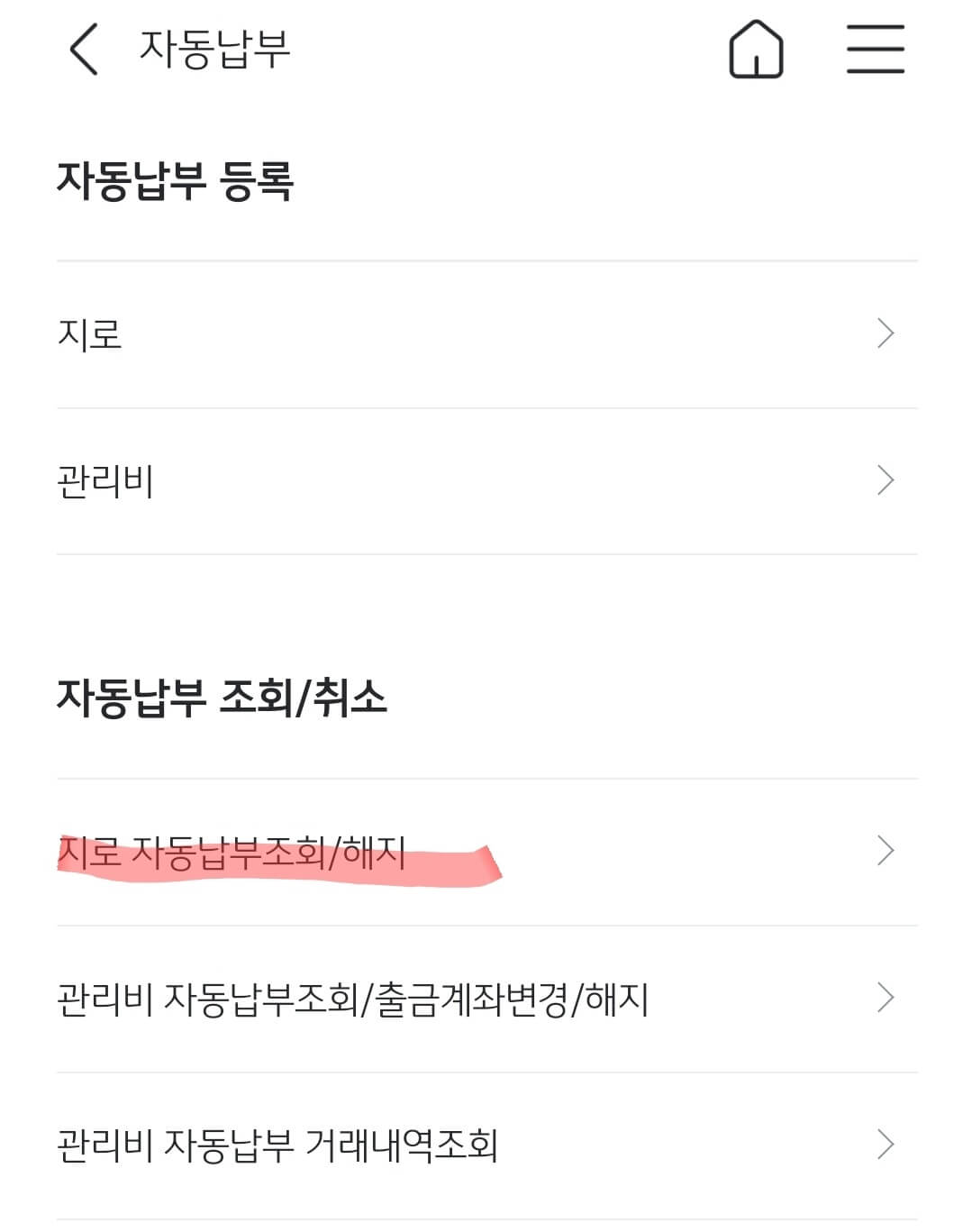 자동납부 등록 화면에서 지로/관리비 등을 조회해 보실 수 있습니다. 보통 자동이체를 신청한 내역이나 기부금 납부시에는 [지로] 화면에서 검색이 가능하니 참고하세요.