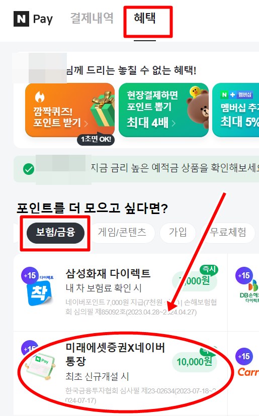 네이버페이 홈페이지에서 통장개설 및 혜택받기가 가능합니다. 네이버페이 홈페이지에서 혜택 > 보험/금융 > 미래에셋증권x네이버통장 이벤트를 선택해주세요. 다음 화면에서 상세 이벤트 내역을 확인해보시고 화면 하단의 개설 및 혜택받기 버튼을 눌러주시면 네이버포인트 10000원이 즉시 지급됩니다.